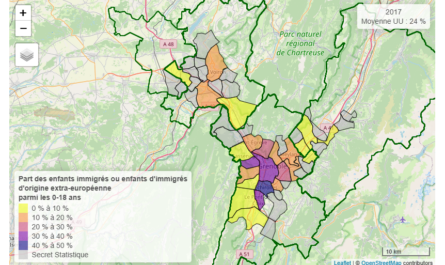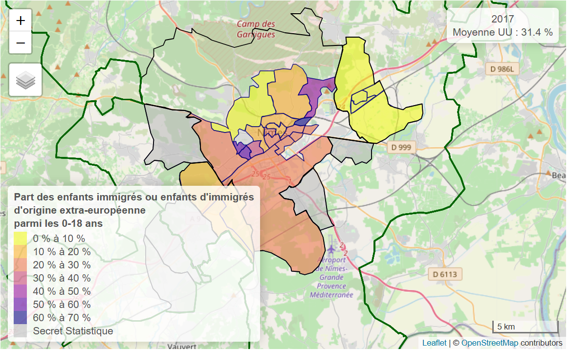La structure démographique de la jeunesse nîmoise, observée à travers la répartition des enfants immigrés ou enfants d’immigrés d’origine extra-européenne, révèle un paysage urbain marqué par de profondes différences territoriales. La carte issue des données de 2017 permet d’approcher la trajectoire de la génération née autour de 2008, aujourd’hui âgée d’environ seize ans. Ces jeunes ont grandi dans une ville moyenne du sud où les contrastes sociaux et spatiaux demeurent particulièrement visibles, façonnant leur quotidien, leur environnement scolaire et leurs perspectives.